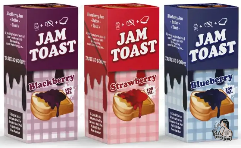 น้ำยาบุหรี่ไฟฟ้าจากแบรนด์ระดับตำนานรุ่นแรกๆ อย่าง Jam Monster สำหรับรุ่นนี้มาในน้ำยาบุหรี่ไฟฟ้าที่ชื่อว่า Jam toast เป็นน้ำยากลิ่นฮันนี่โทสต์ราดแยมมี 3 รสให้เลือกได้แก่ แบล็คเบอร์รี สตรอว์เบอร์รี และบลูเบอร์รี หอมอร่อย น้ำยาตัวนี้มีไม่มีความเย็น เน้นกลิ่นหอมล้วน ๆ บรรจุมาในขวดขนาดมาตรฐานของแบรนด์คือ 100 ml นิโคตินนิค3mg ลองแล้วจะติดใจจนวางไม่ลง ใครที่ชอบไม่เย็นต้องจัดสักขวด
