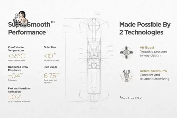 โดยเทคโนโลยีที่ทาง RELX Infinity ได้ใช้นั้นคือ Active-Steam Pro และ Air Boost โดยที่ Active-Steam Pro นั้นสามารถปรับสมดุลและควบคุมการทำงานของอะตอมรวมถึงควบคุมอุณภูมิความร้อน ในขณะที่การออกแบบสำหรับ Air Boost นั้นใช้หลักอากาศพลศาสตร์ ที่ออกแบบภายในหัวพอทใหม่ทำให้เกิดแรงดันเพื่อผลักไอขึ้นจากอะตอม ไม่เพียงเท่านั้น RELX Infinity ยังได้พัฒนาในเรื่องของการซึมของหัวพอทได้ดีมากทีเดียว อีกทั้งยังเพิ่มความจุแบตเตอร์รี่ และยังมีระบบชาร์จแบบแบบไร้สายอีกด้วย เป็น พอตบุหรี่ไฟฟ้าที่นิยมอีก 1 ตัว