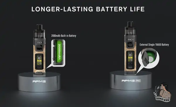 พอตไฟฟ้า RPM5 มาพร้อมกับความจุของแบตเตอรี่ 2000 mAh ซึ่งเพียงพอต่อการใช้งานในหนึ่งวันเพราะชิปรุ่นใหม่ทำให้ไฟนิ่งกว่าเดิม เปรียบได้กับการเติมน้ำยาประมาณ 1-2 แทงค์ก่อนที่แบตเตอรี่จะหมด