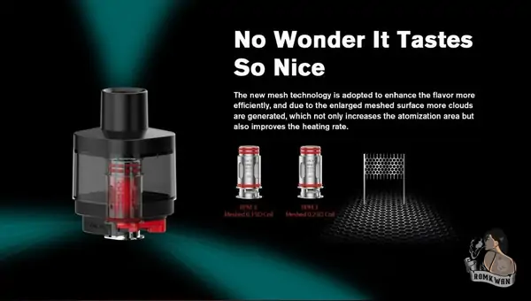 - ได้รับการกล่าวขานว่าให้รสชาติที่ยอดเยี่ยมด้วยเทคโนโลยีตาข่ายที่ช่วยเพิ่มรสชาติ และพื้นที่ผิวของขดลวดตาข่ายเหล่านี้ได้รับการขยายเพื่อเพิ่มอัตราการให้ความร้อนและการปล่อยไอ