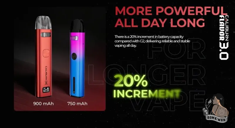 ความจุของแบตเตอรี่เพิ่มขึ้น 20% เมื่อเทียบกับ G2 ทำให้สูบไอได้อย่างเสถียรและเชื่อถือได้ตลอดทั้งวัน