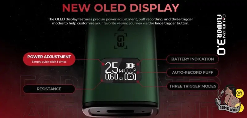 จอแสดงผล OLED มีการปรับพลังงานที่แม่นยำ การบันทึกแบบพัฟ และโหมดทริกเกอร์สามโหมดเพื่อช่วยปรับแต่งการเดินทางสูบไอที่คุณชื่นชอบผ่านปุ่มทริกเกอร์ขนาดใหญ่