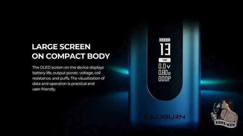 Caliburn X มีขนาดที่กะทัดรัดมาพร้อมหน้าจอขนาดใหญ่แบบ OLED ที่จะแสดงความจุของแบตเตอรี่ กำลังไฟที่ปล่อยออก แรงดันไฟฟ้า ความต้านทานของคอยล์รวมถึงมีตัวนับจำนวนคำสูบด้วย