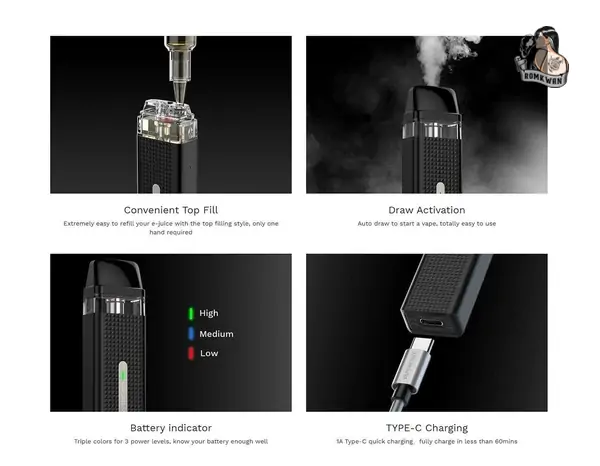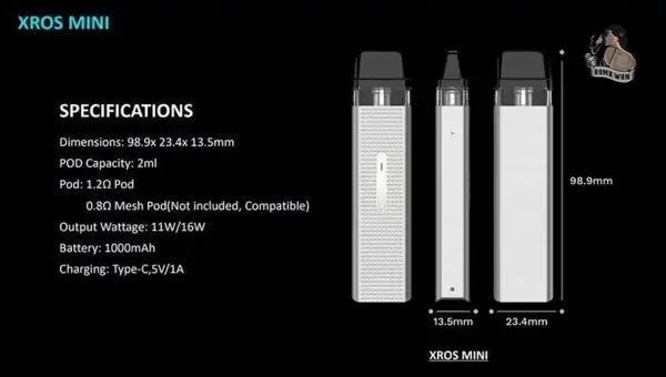 Vaporesso Xros Mini กับความสวยที่จับจ้องทุกสายตาด้วยดีไซน์ผิวเป็นรูปทรงเพรชให้ความรู้สึกที่หรูหราและยังเป็นผิวยึดไม่ทำให้ตัวเครื่องหลุดจากมือง่ายๆอีกด้วยเป็นดีไซน์ที่ไม่ได้มีดีแต่ความสวยงามจริงๆ แบตเตอรี่ให้มาถึง 1000mAh รองรับการชาร์จแบตเตอรี่ด้วยพอร์ตชาร์จแบบ USB Type-C หากไม่ใช่การสูบลากหรือสูบถี่ๆทั้งวัน ก็สามารถอยู่ได้ราวๆถึง 2 วันกันเลยทีเดียว ความจุน้ำยามีให้ถึง 2ml. มีแม่เหล็กช่วยในการยึดตัวเครื่องกับหัวพอตไม่ให้หลุดออกได้ง่ายๆ สามารถเติมน้ำยาจากด้านบนหัวพอตได้อีกด้วยและใช้น้ำยาประเภทซอลนิคให้ฟิลสูบแบบ MTL