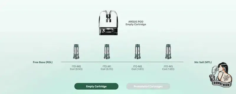 หัวพอตแบบพร้อมคอยล์จะเป็นหัวพอตของ Argus P1 ซึ่งสามารถใช้งานร่วมกันได้ภายในคอยล์จะเป็นซีรี่ย์ ITO ซึ่งเป็นเทคโนโลยีคอยล์ตัวใหม่ของทาง Voopoo มีให้เลือก 2 เบอร์ 0.7 และ 1.2